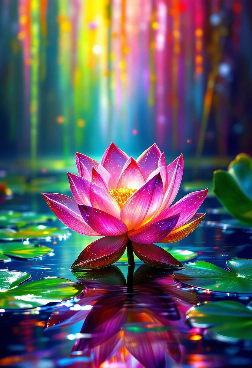 Bright Colors, Vibrant 3D Transparent Lotus, With Few Shiny Leaves In The Pond Rainbow background in the style of Josephine Wall by William Holman Hunt.