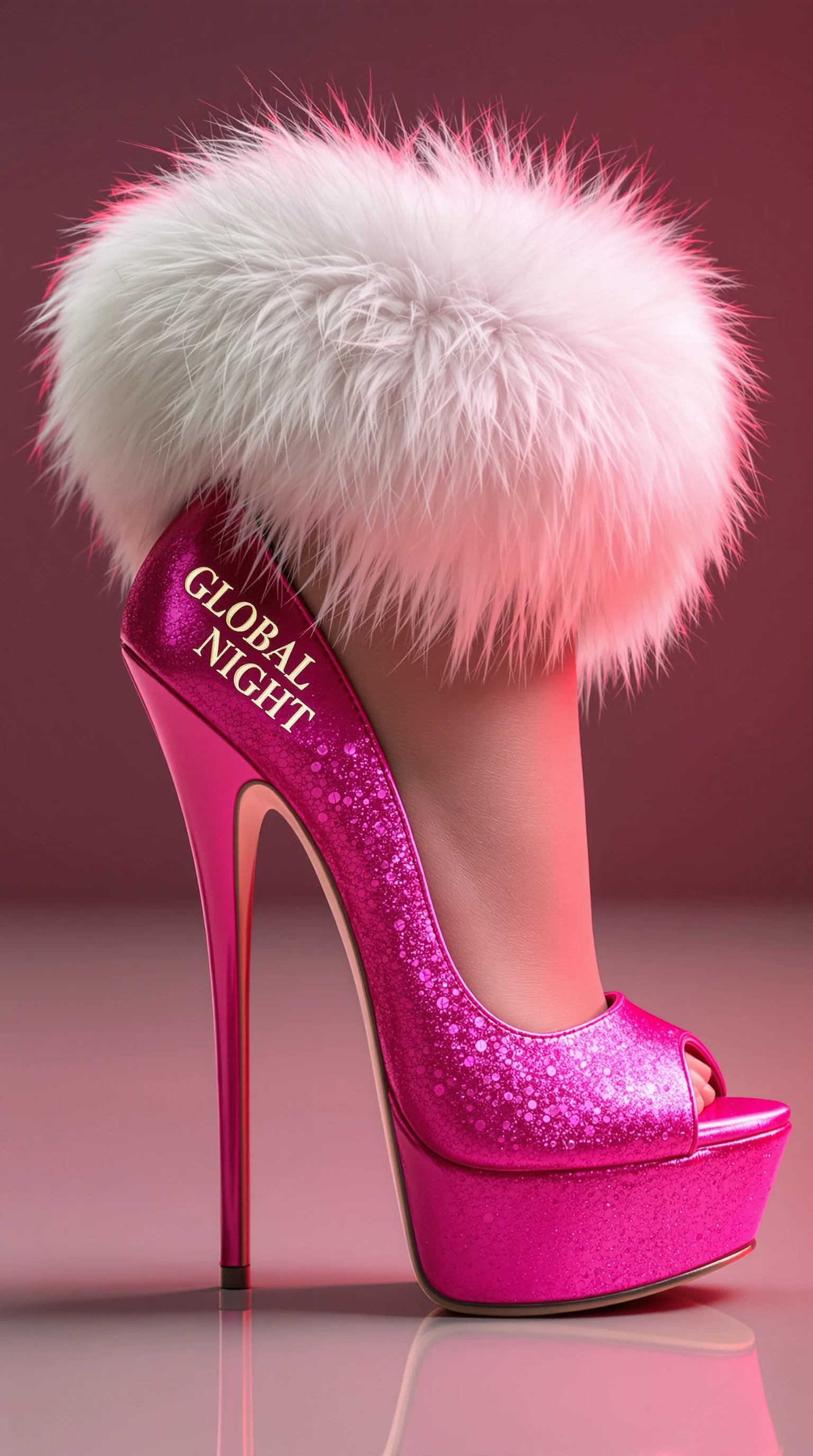 A extrem sexy high pink high heel with a fur Band and the text "GLOBAL NIGHT"