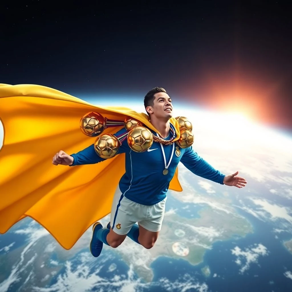 Ronaldo as a superhero, cape made of Champions League trophies, hovering over Earth.