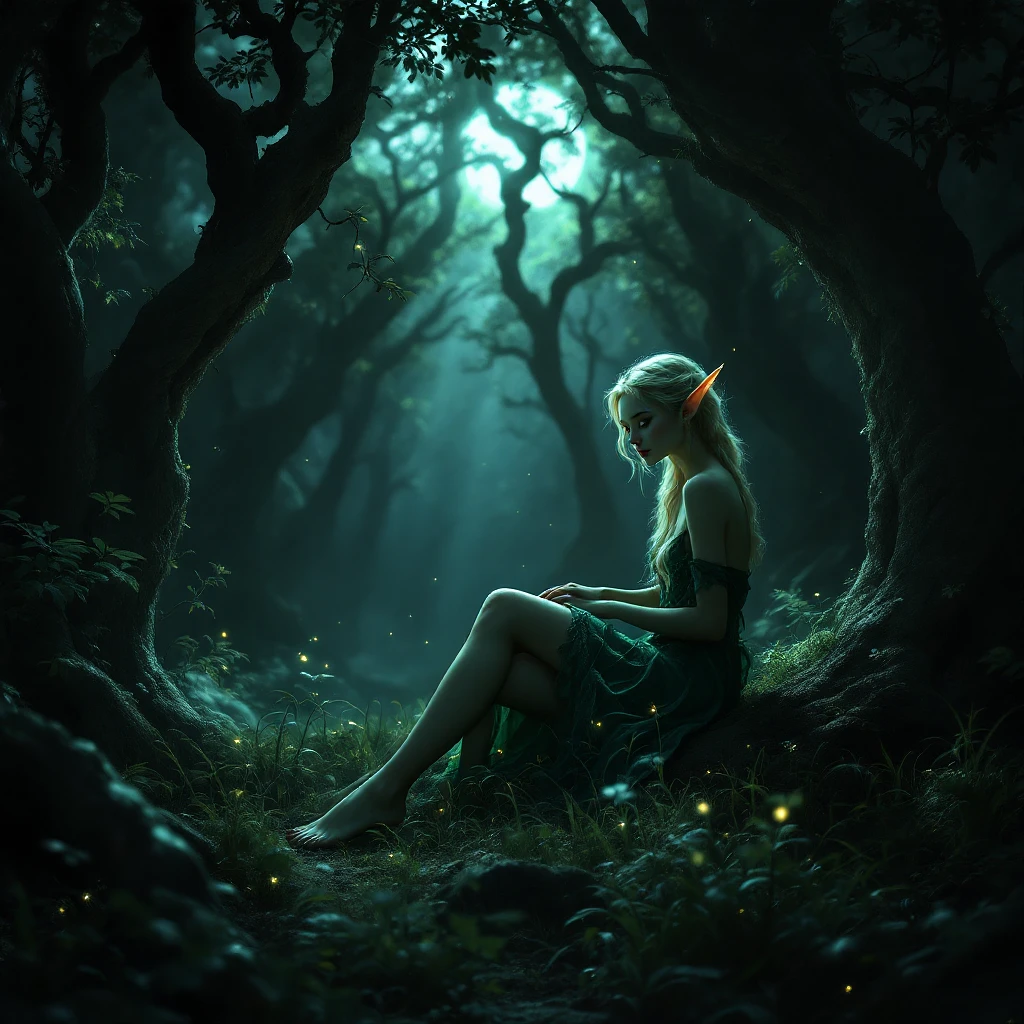 Highly realistic chiaroscuro scene of an enchanted forest in soft pink hues, [Baroque | Romanticism (Realistic) ], A bright ethereal clear light breaking through the dense canopy illuminating a lone well-defined figure of a cute and adorable fair-skinned blonde elf princess relaxing, her delicate features and skimpy, clinging, loose emerald green dress glowing against the dark background, her bare feet perched on the fine grass [No Deformation] [Oil Painting Photo | Digital Art] , Inspired by [Caravaggio | Caspar David Friedrich] , [Dramatic Lighting | High Contrast] , Inspired by [Mystical Forests | Fairy Tales] , A mysterious forest bathed in moonlight, ancient twisted trees casting deep shadows, fireflies creating a soft halo around them, a sense of magic and wonder pervades the scene, 8k Resolution, Trending on ArtStation. by Satori Canton