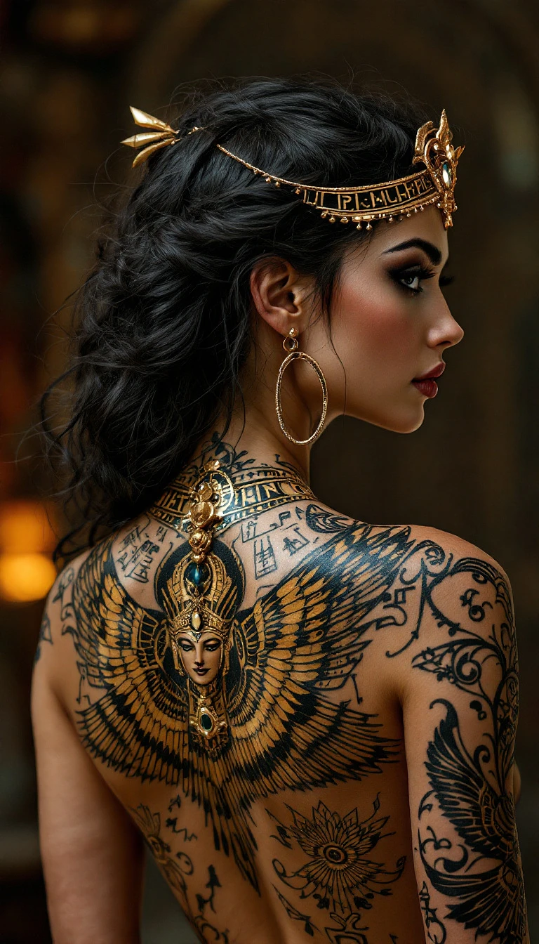 Super detailed 8K Low-angle shot full-body portrait of a mesmerizing female Egyptian goddess, back turned, intricate hieroglyphic tattoos adorning her back, symbolizing ancient power and divine authority, evoking the grandeur of Egyptian murals, the refined lines of Alphonse Mucha, and intersecting with the hyperrealism of Robert Longo, the mystical forms of Alex Grey, embodying divinity, beauty, authority, HDR, RAW, close-up, regal.