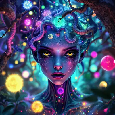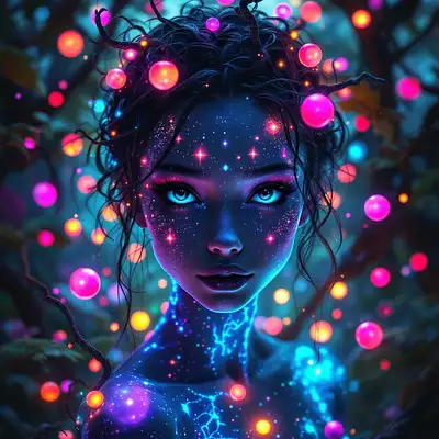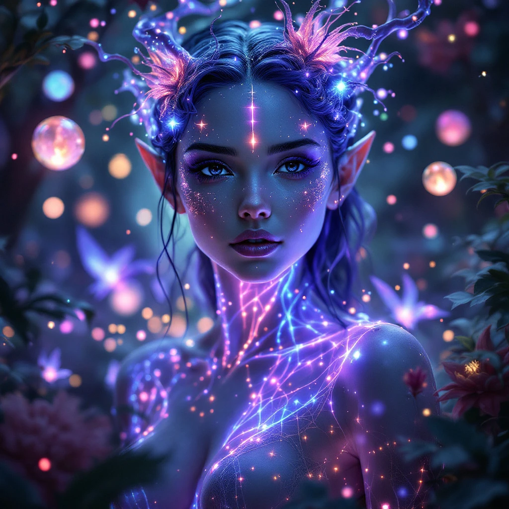 Surreal 4k painting of a beautiful elf princess with expressive black eyes and cosmic features. Her skin appears to be composed of intertwined bioluminescent particles, surrounded by neon lights and floating, colorful orbs in a fantastical forest environment, with exotic animals creating a mesmerizing and otherworldly atmosphere, cinematic composition.
