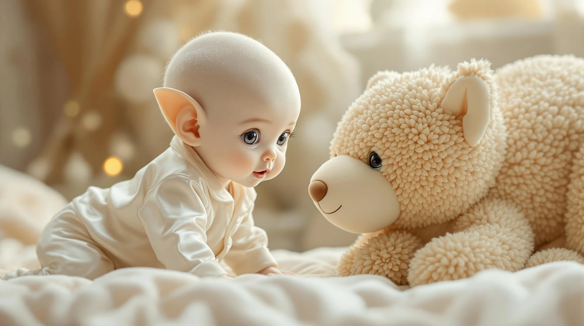a beautiful and (cute alien baby ) with topaz color eyes, pointed ears, wearing a silk white adorable pyjamas, crawling toward a plush animal, the plush animal is much larger than the baby, set against a soft, cream and white tone background that adds warmth and coziness to the scene, the atmosphere is very charming, and full of love and happiness, uhd beautiful details and textures, perfect image characters photorealistic quality
