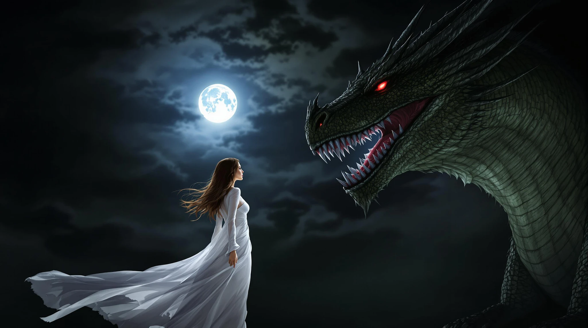 The image depicts a woman in a white dress standing in front of a large dragon, with a full moon in the background. The woman has long brown hair and is wearing a long, flowing white dress that appears to be made of a lightweight material. The dragon is massive, with its head and neck filling the right side of the image. It has glowing red eyes and sharp teeth. The background of the image is a dark, cloudy sky with a full moon shining brightly through the clouds. The overall style of the image is fantasy, with a focus on the dramatic and mystical elements of the scene.