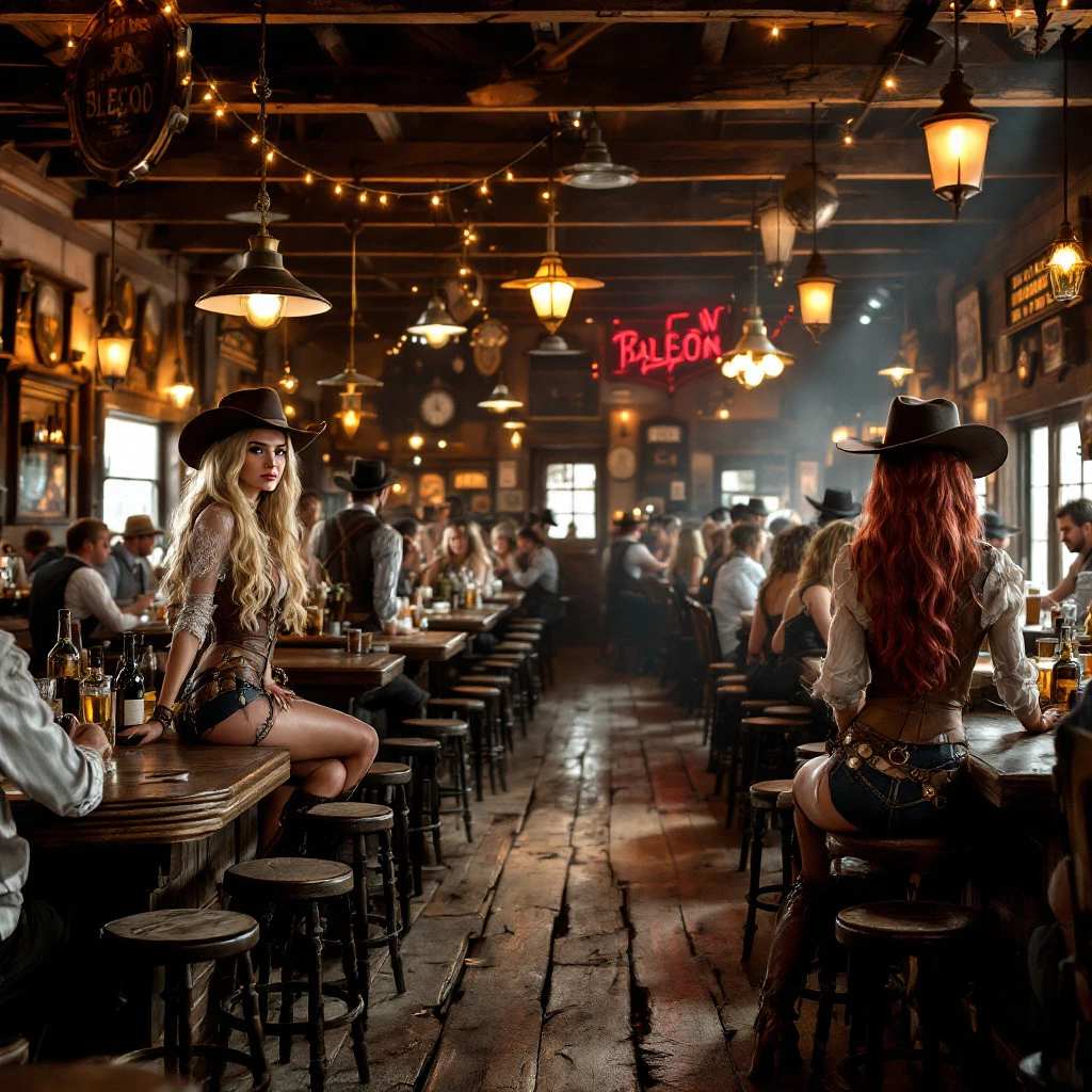 wide view of a saloon. A Vibrant Old West saloon filled with lively patrons and lovely old west female waitresses facing camera, dressed in stylish combinations of Western boots, leather vests, lace tops, bandoleros, cowboy hats. Each woman has unique long hair in different colors. 4K hyper-realistic saloon background with low contrast --ar 2:1 no extra fingers