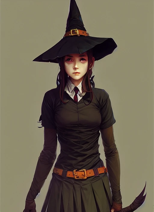 rugged girl witch wearing magic school uniform, large wide - brimmed witch hat, cinematic, elaborate, elegant, masterpiece, illustration, digital painting, concept art, trending on artstation, pixiv, art by ruan jia and hong soonsang and wlop and artgerm and greg rutkowski and alphonse mucha