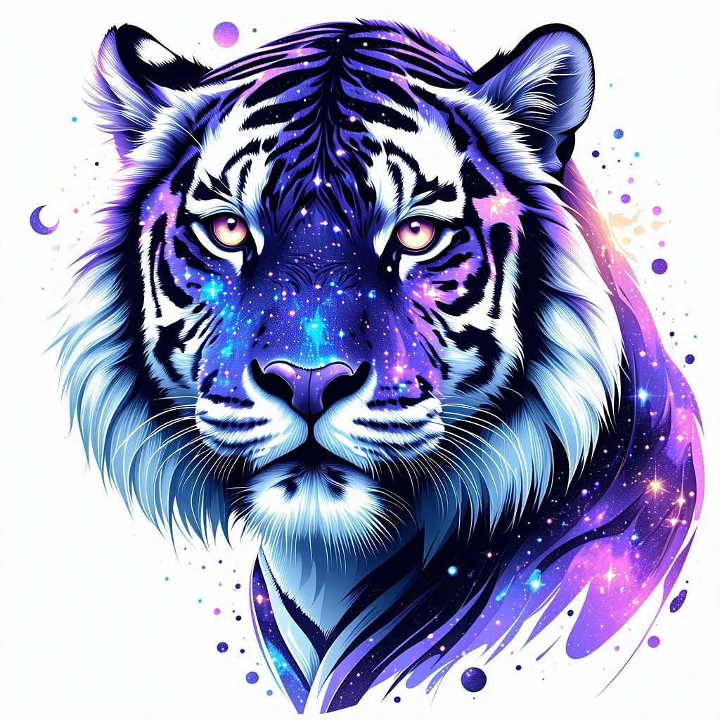 "A bold and clean illustration of a cosmic tiger designed for stickers. The tiger's face is filled with galaxy-like patterns, including stars, nebulae, and a glowing crescent moon on its forehead. The design has sharp, vibrant edges and a transparent background, ensuring it stands out on any surface. The color palette includes vivid purples, blues, and silvers, with high contrast to make the tiger pop on small sticker sizes. "
