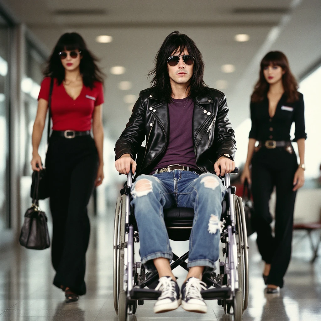 joey Ramone, with his long black hair and bangs , in his leather jacket and purple t-shirt , drifter rayban sunglasses , distressed blue jeans and converse white shoes being pushed in a wheelchair at airport by sexy stewardesses