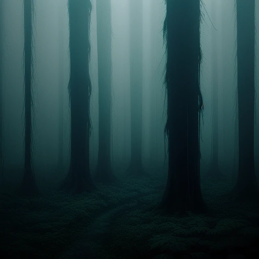 a photography of An eerie forest overtaken by radiotrophic fungi, faint blue Radioactive luminescence, gloomy, fog