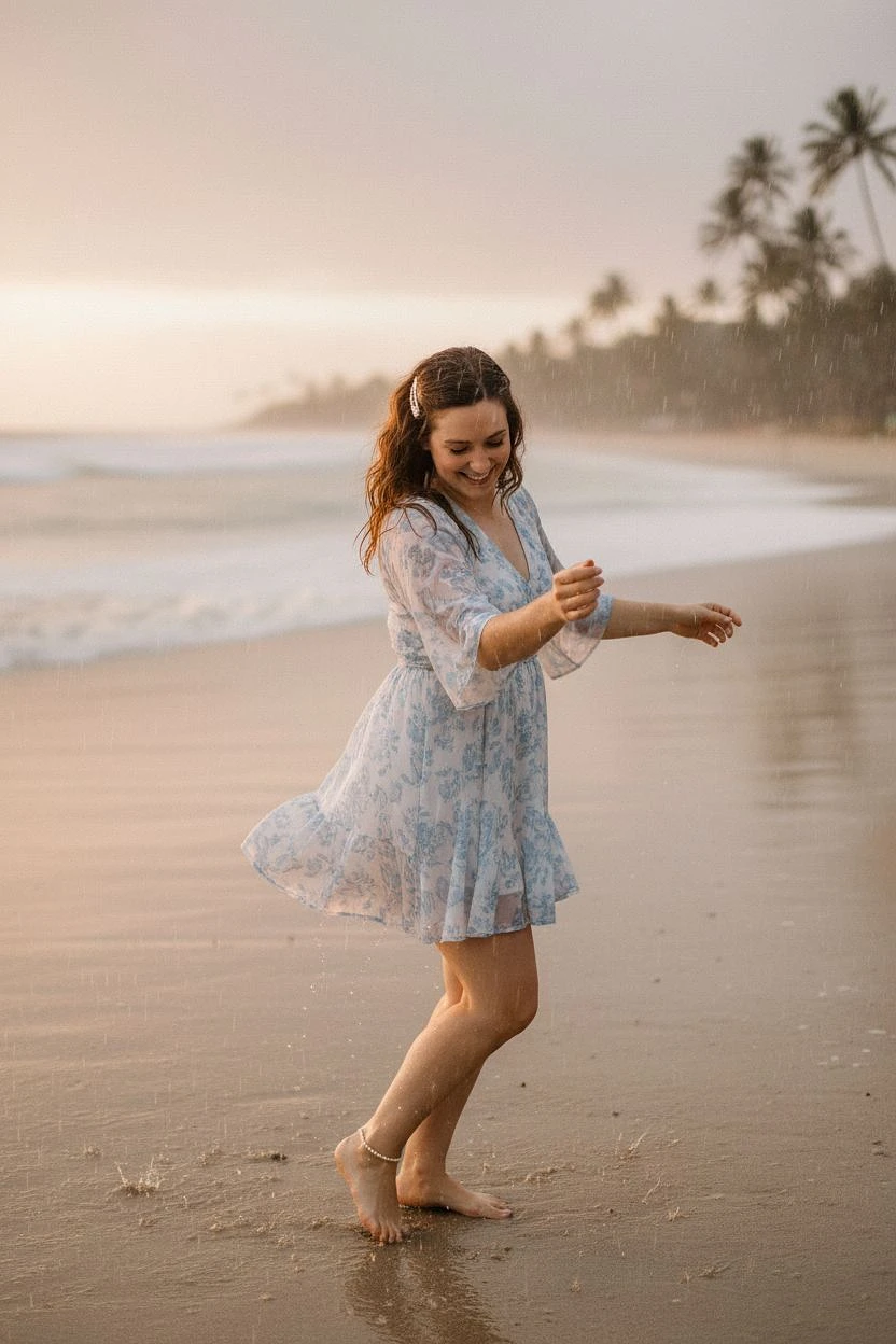 uploaded woman dancing in rain around beach wearing beachy white-skyblue colour short frock who had medium long curvy hair with short hairclip tied , wearing anklet made of pearls. hyper-realistic, photorealistic with no cartoon, anime, CGI, or painted effect. Cinematic frame in 2. 39:1. Shot with a 50mm lens, shallow depth of field, soft bokeh. Lighting is warm. Color grading with soft tones, desaturated background, dreamy glow using a Pro-Mist effect.