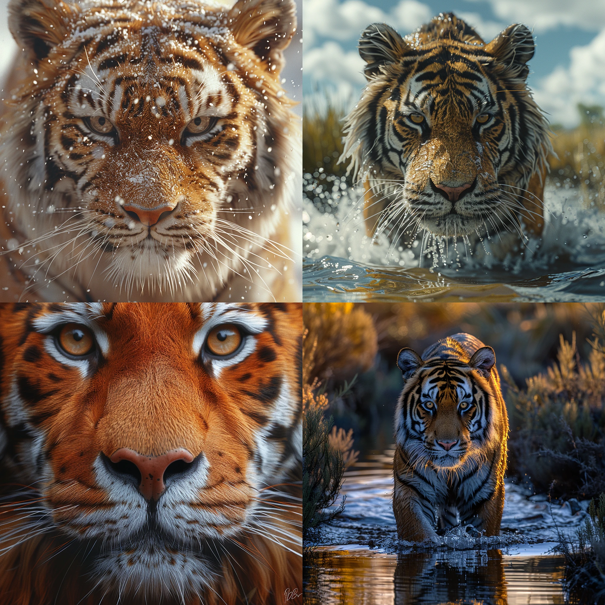 an image of a tiger by photographers Will Burrard-Lucas, Vincent Munier, Paul Nicklen, Roeselien Raimond, and Paul Souders; a high-resolution, photorealistic image that exhibits hyperrealism, a high level of texture detail, accurate lighting and shadow rendering, material properties and fine details, boasting realistic colors and a naturalistic composition, accurate perspective, and the depth perception should evoke a sense of reality, The surface reflection should demonstrate ambient occlusion, global illumination, and subsurface scattering, intense image refinement and neural rendering, incorporating advanced training techniques and using high-quality datasets, progressive growing networks, multi-scale processing, attention mechanisms, and self-attention modules, effective noise reduction, image denoising, and image inpainting techniques. Techniques relating to content-aware filling should also be noticeable. --chaos 30 --stylize 800 --v 6
