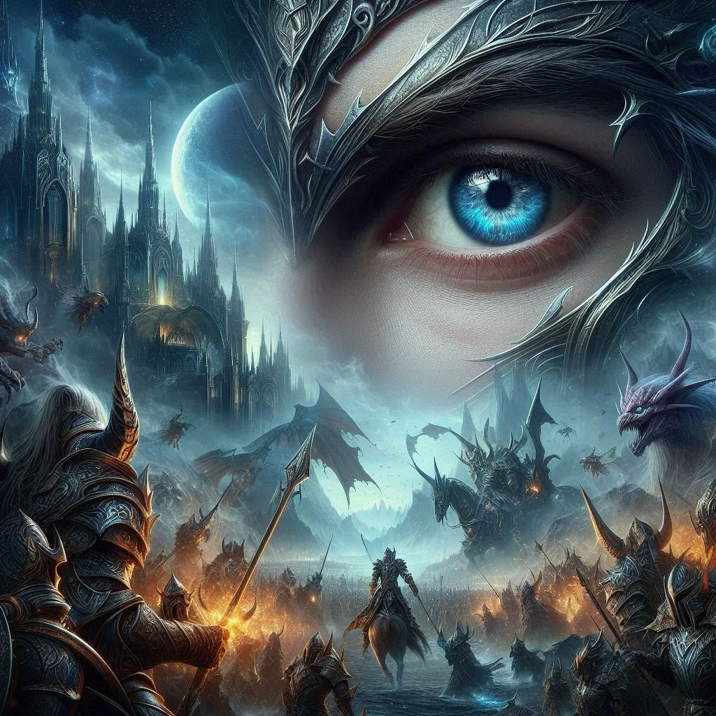 an epic poster-style photograph inspired by the Warcraft universe, rendered with unprecedented photographic realism and cutting-edge 3D artistry. Feature a hyper-realistic portrait of the main hero in intricately detailed armor, amidst a chaotic battlefield teeming with mythical creatures and powerful magic. Subtly integrate an elf's eye as the central element, blending it naturally into the scene like the crescent moon in a night sky, with reflections of colossal castles, soaring dragons, and fierce warriors. Use vibrant colors and dynamic lighting to accentuate the intensity and scale of the battle. Ensure the visual is breathtakingly detailed, with a majestic and immersive atmosphere, without any text or film name.