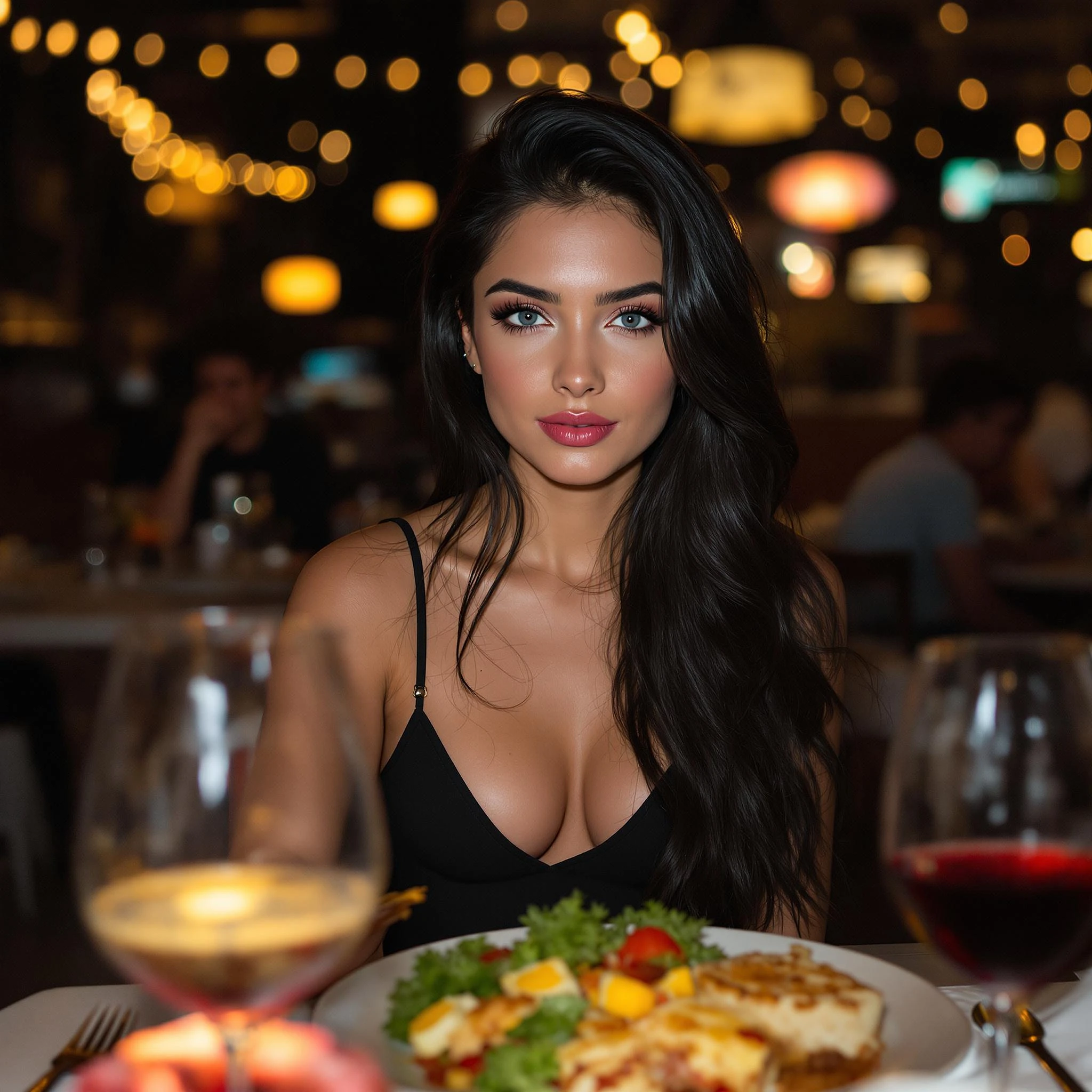 18-year-old woman, black hair, light blue eyes, tanned white skin, thin body, and light makeup. She's wearing black dress, having dinner in a restaurant at night