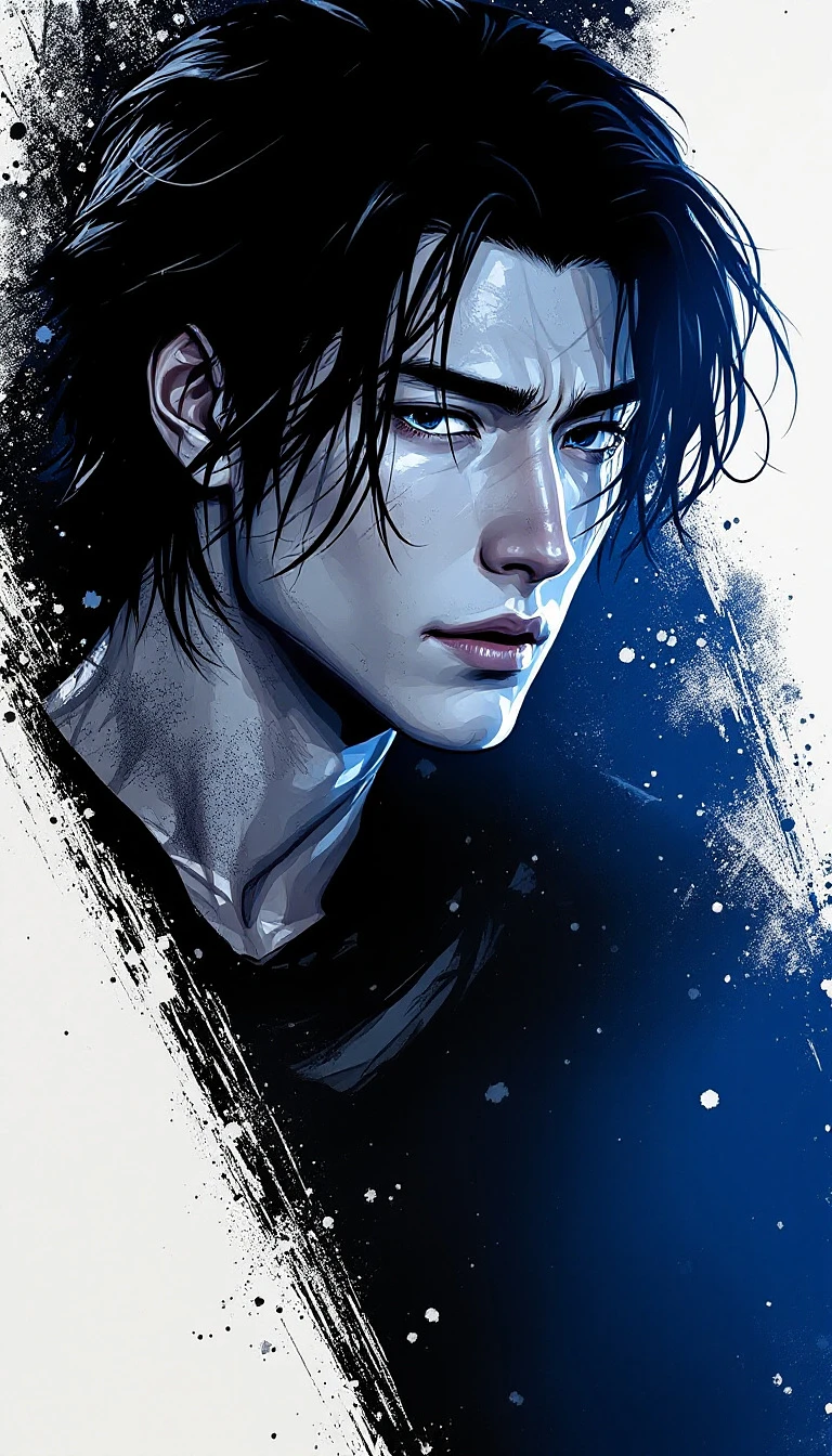 movie poster, male character in black, white and blue, in the style of yoh nagao, light-focused --ar 71:128 --stylize 750 --v 6