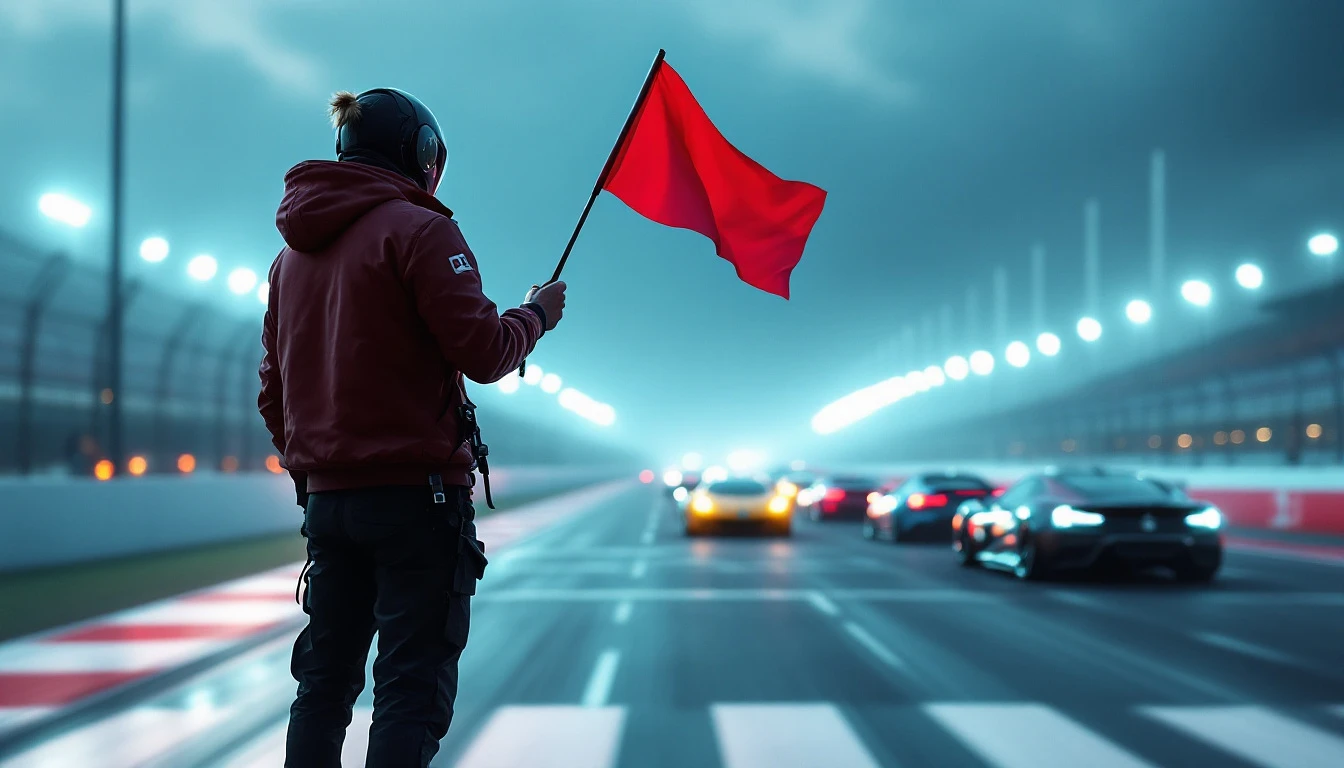 The starter is a person standing on the side of the racing track behind the track with a whistle and a flag. He whistles and gives the go-ahead signal with a flag. The camera looks from the side, front and slightly above the man with the flag and 5 cars. Style - cyberpunk