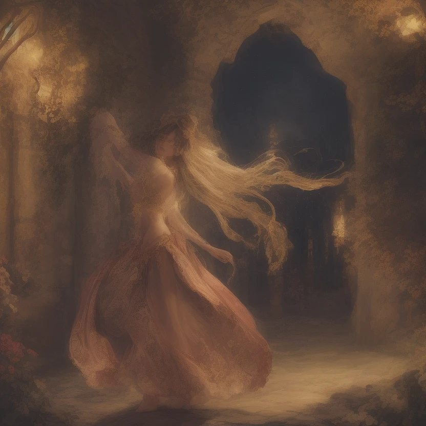 Rays of bright full moonlight and torchlight dance around her, casting a whimsical glow over her red and gold belly dancers outfit (((swirly bokeh) )) amidst a medieval castle courtyard backdrop at midnight. Soft, natural moonlight bathes her form, illuminating her sensuous pose. She stands barefoot, surrounded by vibrant flowers, her gaze captivating the viewer. Her elegant, black band encircles her neck adding to intrigue. Her hip-length wavy raven hair cascades down her back. Her back is to the camera, and she looks over her shoulder, inviting the viewer's attention. Captured with a Leica M10 and Helios-44 58mm f/2 lens, stopped down to F2. 8, this fine art color photograph boasts deep, rich tones and lovely highlights. Midday sunlight enhances her radiant expression, while the soft, diffused light shines through her raven mane, highlighting her figure's contours.