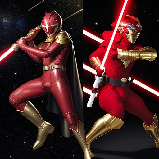 RED SPANDEX SUIT, WITH GOLD GLOVES AND BOOTS , wearing a RED ranger helmet HOLDING a lightsaber vs ANOTHER BLACK SPANDEX SUIT CHARACTER , WITH GOLD GLOVES AND BOOTS , wearing a black helmet and yellow cape HOLDING a lightsaber IN A SWORD FIGHT in space.