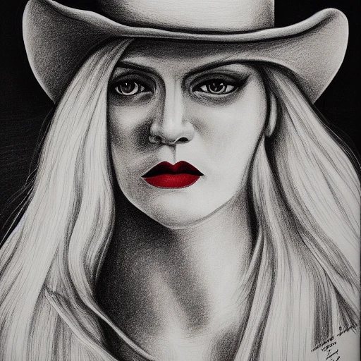 a drawing of a pale female with straight ginger hair hazel eyes, a serious expression, and red lipstick in the style of wildwest gothic, western-style portraits, sharp focus, moody lighting, realistic figures, wearing a black cowboy hat, nude, complete boddy.