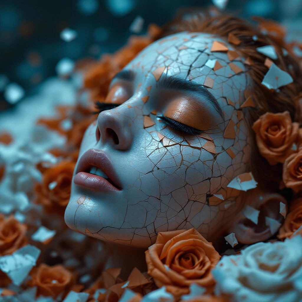 Death of a beautiful humanoid female, close up of a broken android, digital art, cracked porcelain face, full body, futuristic look, captivating, close-up, skull, fragile, emotional, shatter into fragments, shattered glass, shattered pieces of a woman body, made of porcelain, broken, destroyed, abstract patterns, tile art, roses, portrait photography, cinematic, matte orange and light shiny blue, shallow depth of field --ar 4:5 --s 750 --v 6