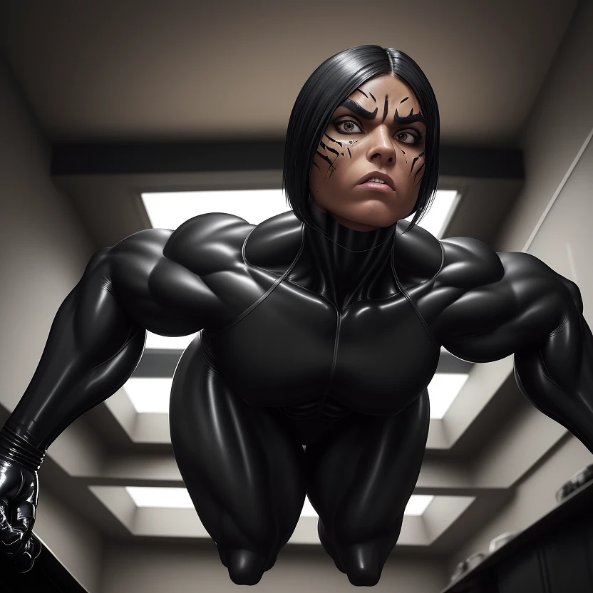 a tan-skinned tomboy bodybuilder woman wearing her black symbiote and wearing black latex symbiote socks, muscular, black hair, clean face, feminine face, wide jaw, black symbiote feet visible, flexing like a competitive bodybuilder, view from below, bedroom background,