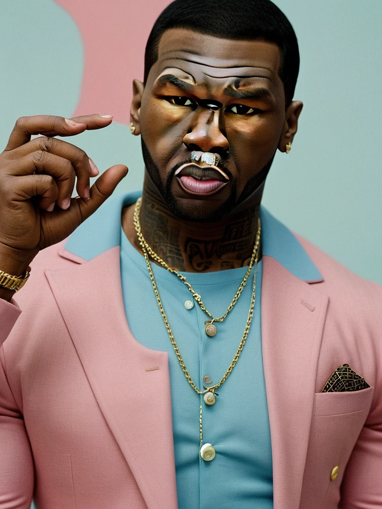Vogue style photo shoot of 50 Cent as character therock from the movie The Royal Tenenbaums pastel colored background in Wes Anderson style, hyper - realistic photography, Wes Anderson style, full body, 8k, close - up shot, close - up photo