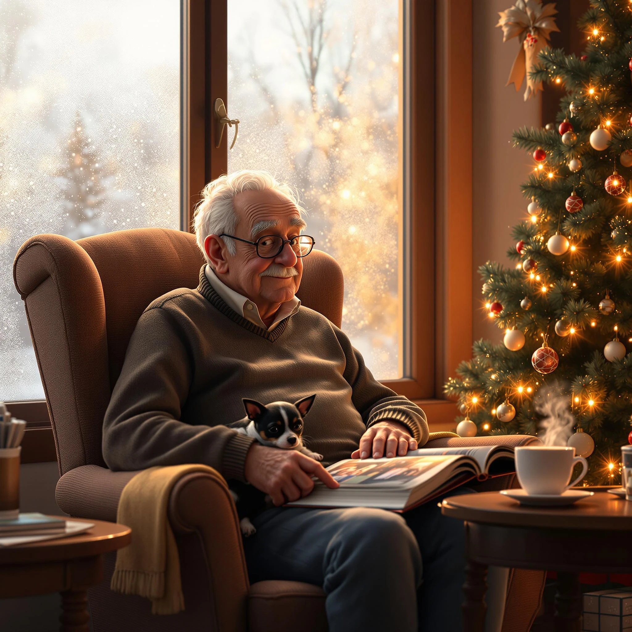 A Pixar render-style medium shot of an elderly man sitting in a cozy armchair, with his small black and white Chihuahua lying down, by a frosted window on a snowy morning, with a glowing Christmas tree in the background. A family photo album rests on his lap, and a steaming cup of coffee is on the table beside him. Sunlight streams through the window, casting a warm, peaceful glow across the room. The atmosphere is reflective, tranquil, and heartwarming.