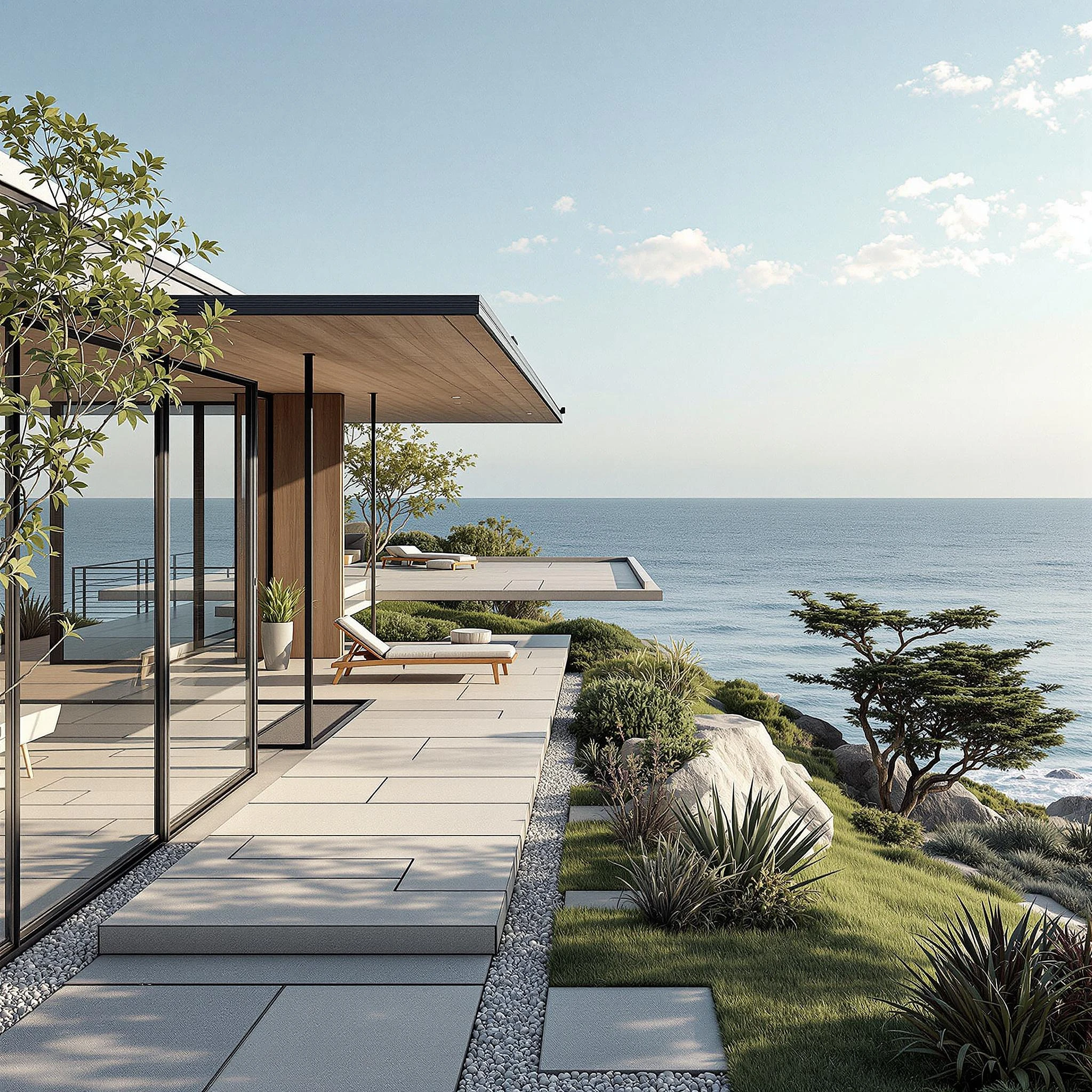 Hyper realistic eye level exterior photo of a mid century modern style house overlooking the ocean, daylight, indirect lighting, AD magazine, Frank Lloyd, Eames, Mies van der Rohe