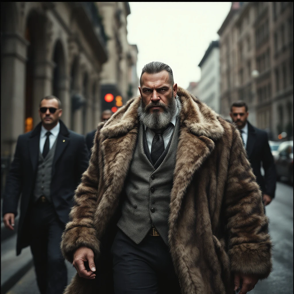 A rich and muscular man dressed in furs without a beard or glasses walks along a wide street, accompanied by two security guards in business suits, high realism, 8k