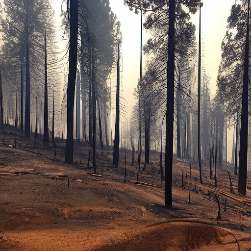 Close up photo of log canyon in, forest fire growth, dry pine trees, haze,