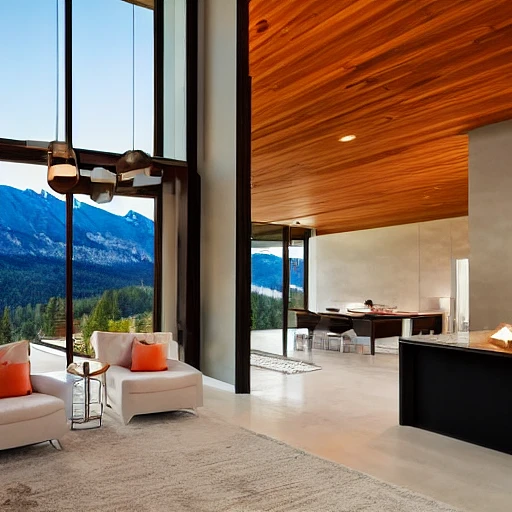 A modern, minimalist dream home nestled in the mountains, with floor-to-ceiling windows offering stunning panoramic views of the surrounding wilderness. The interior is sleek and contemporary, with clean lines and a neutral color palette, featuring state-of-the-art technology throughout