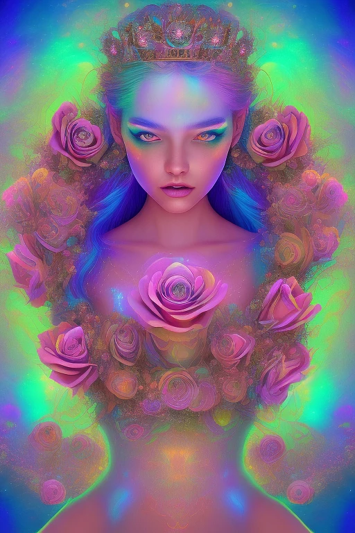 Abstract+realistic iridescent rose flower princess| standing on a iridescent vibrant colored hill | centered| key visual| intricate| highly detailed| + bioluminescent beauty celestial glowing background mesmerizing+ breathtaking| precise lineart| vibrant| panoramic| cinematic|