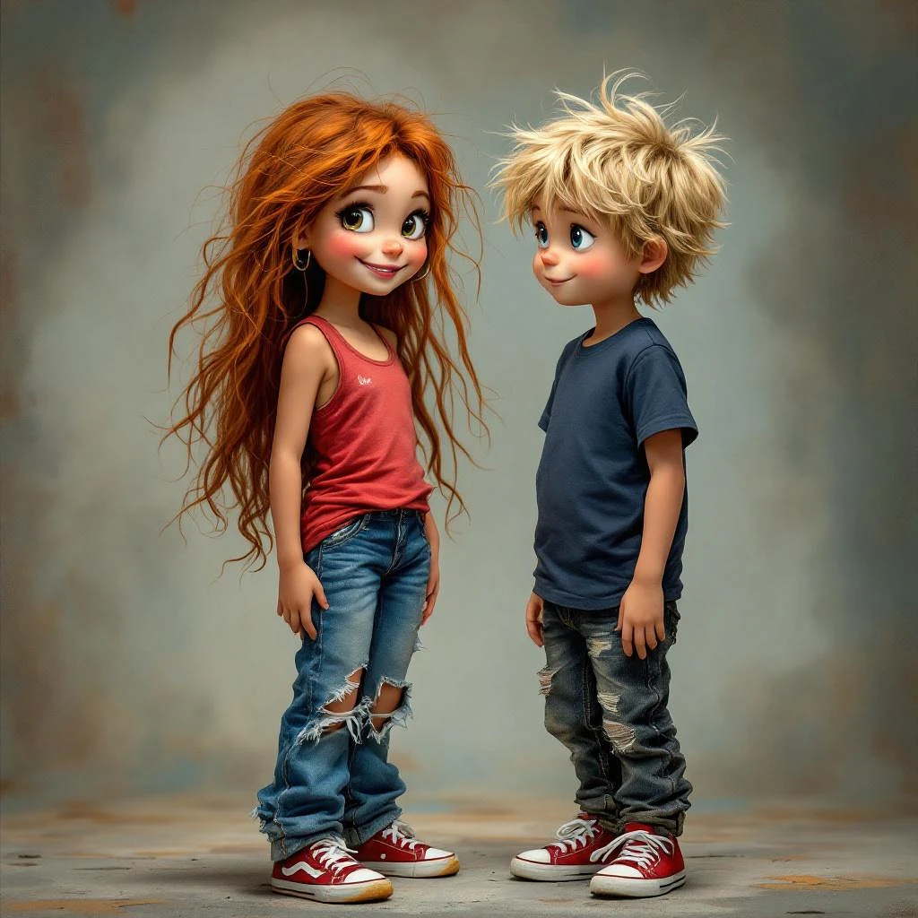 whimsical cute little girl with long messy auburn hair, happy sassy grin on her face, glossy honey hazel eyes, wearing a red tank top, torn blur jeans, red sneakers, her hands are on her hips, facing her is a cute boy standing by her with blonde messy hair, blue eyes, navy blue t-shirt, worn jeans, sneakers, textured background
