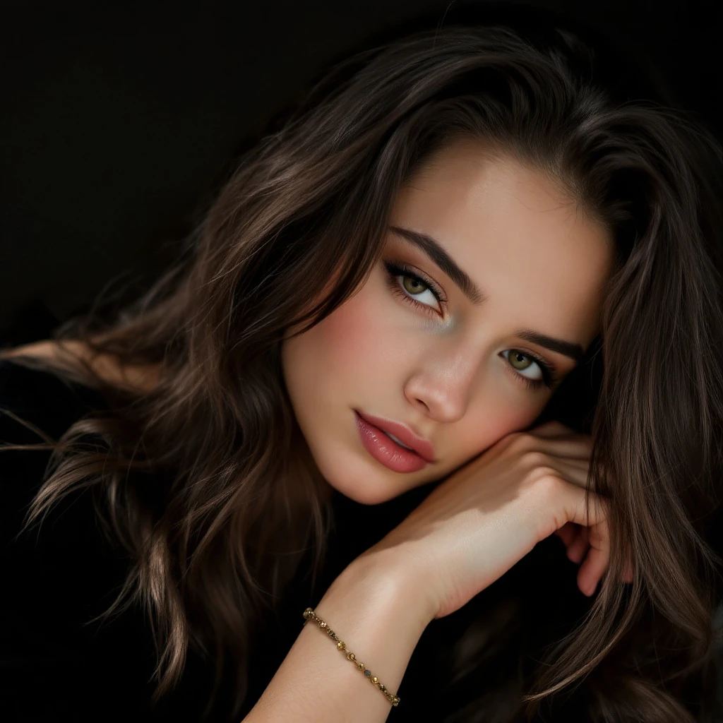 A young woman with long wavy brunette hair rests her head on her clasped hands. She wears a black top and a delicate bracelet on her left wrist. Her expression is soft and contemplative, with natural makeup and subtle pink lipstick. The background is dark and blurred, focusing on her face and hands. more natural normal mackup ultra realistic