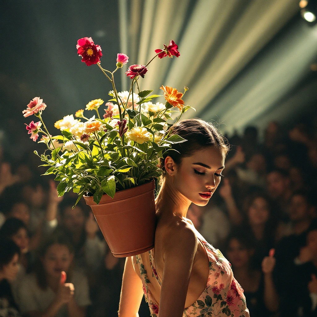 A photo model bending over with a large pot flower stuck to her back her back. In the background is a crowd of people with their thumbs up. Rays of light emanate from behind her head.