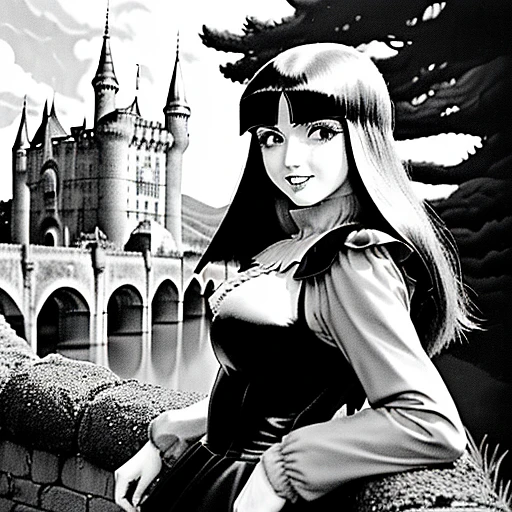 foto de gran calidad de una chica gotica anime en estilo retro vintage anime, al estilo de berserk, la chica esta parada mirando a camara con una expresion sadica de felicidad con la lengia afuera mostrando colmillos afilados, hay un castillo gotico de fondo de la epoca media val y es de noche, todo detras de la chica se ve desenfocado.