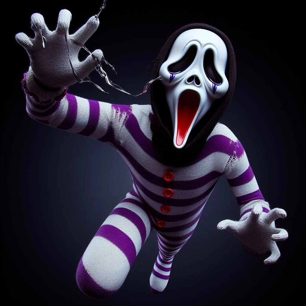 Personaje de terror lanzandose haciendo un screamer, Tiene una cara blanca parecida a una máscara con agujeros negros y una sonrisa espeluznante, le salen rayas moradas que simulan lágrimas y lápiz labial rojo pintado en un fruncimiento exagerado. Su cuerpo recuerda al de un mono calcetín, con forma redonda y oblonga, cintura delgada, tres botones blancos y manos redondeadas con tres dedos larguiruchos cada una, fondo oscuro