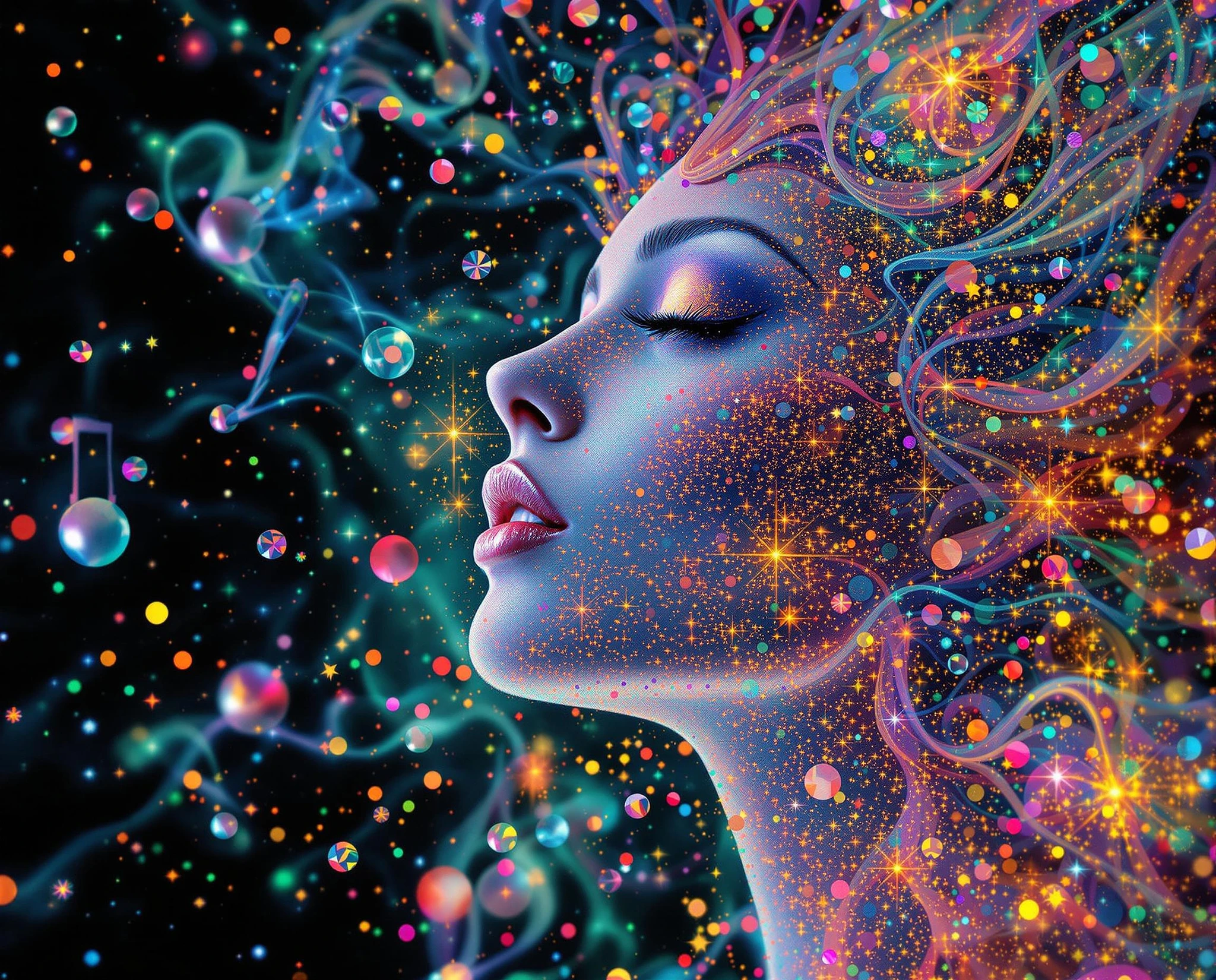 Extreme macro close-up semi-transparent portrait illustration composed of luminous points, Abstract synesthesia artwork, acrylic pour technique, black light source. Silhouetted goddess figure, upper left, pouring from celestial ewer. Musical notes and wildflowers swirl in a kaleidoscopic stream. Bold colors, 3D textures. faces the viewer with flared wings. Vintage Art Noir style, comets and stars cascades against a starry backdrop. Muted rainbow watercolor tones, fine lines, and a serene ambiance.