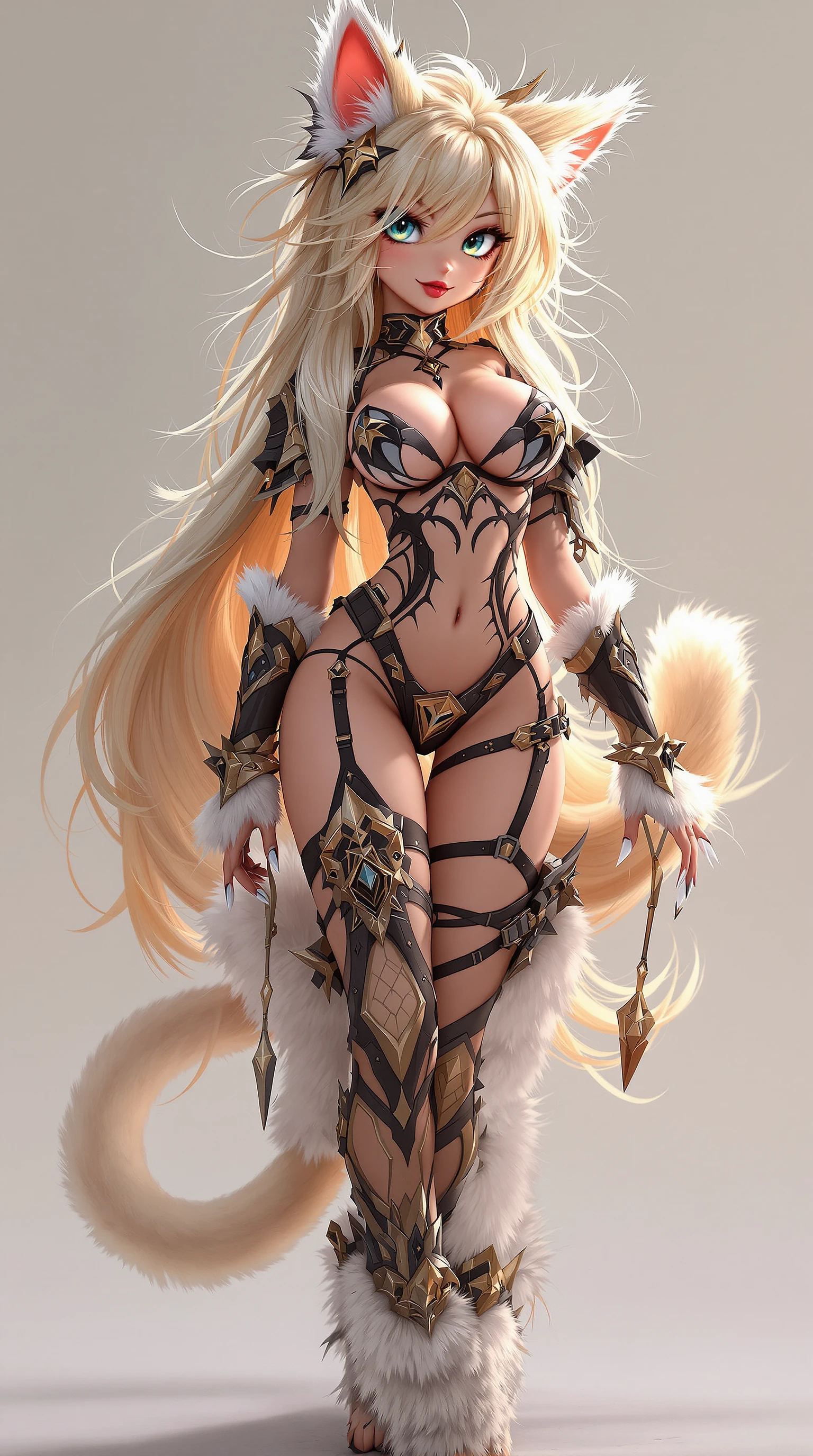 sexy furry cartoon cat girl, 3d anime style, cat tail, cat ears, cat fur, color fantasy armor, look like miqote, long hair, 28 years old, petite, long legs, medium chest, babe, big lips, long nails, sexy, sexy expression