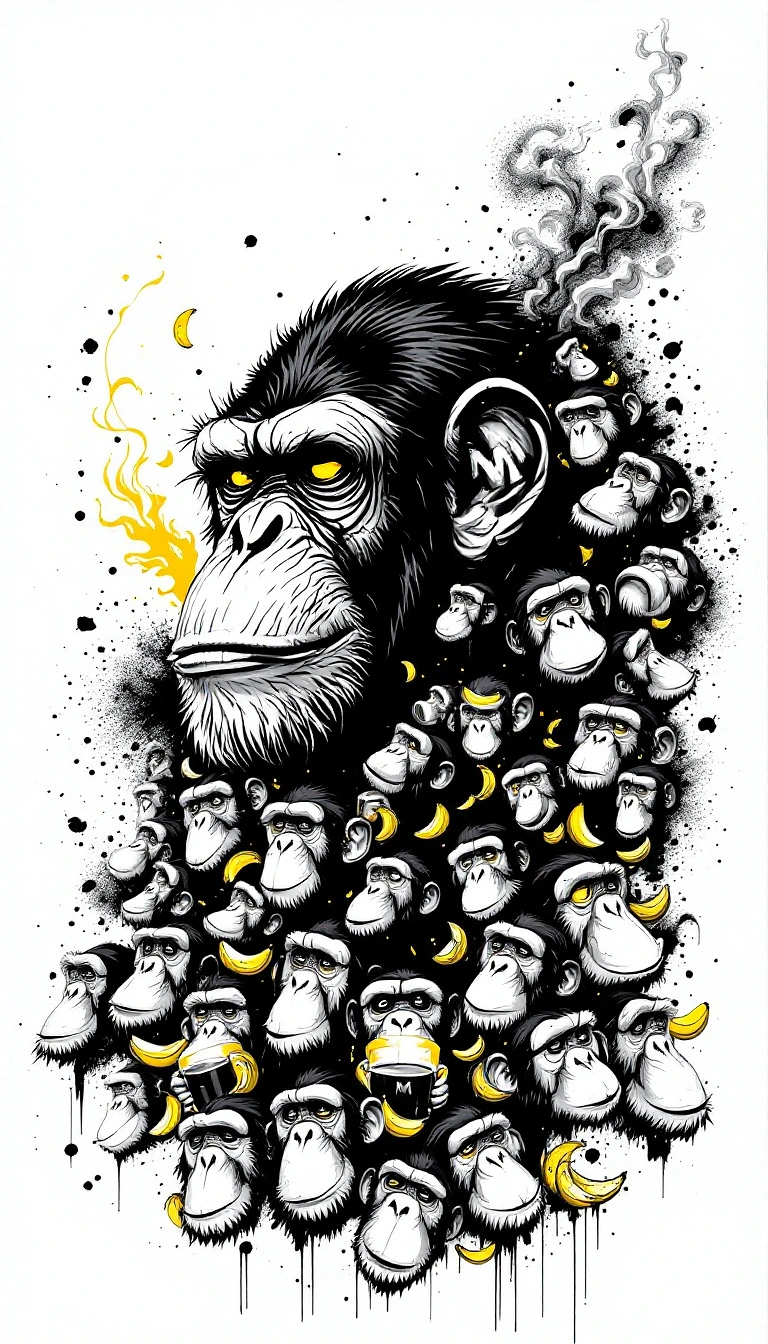 An intricate and mainly black, white, yellow, green, (two contrasting, extra colors for details) , graffiti-style poster featuring various elements, such as 30 chimp cartoon characters, symbols of urban culture, smoke and dynamic expressions, focusing on minimalistic chimp faces, the letter 'M' inside a large circle, bananas, beer, is part of the image. the word and '2007' is hidden --ar 63:128 --stylize 750