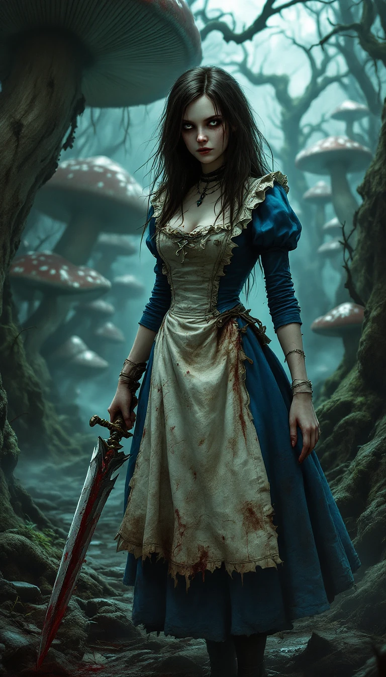 Alice Liddell from Alice: Madness Returns, dark brown hair, pale skin, wearing a tattered blue Victorian-style dress with a dirty white apron, holding a blood-stained Vorpal Blade, standing in a decaying, twisted Wonderland, surrounded by ominous giant mushrooms, dark, misty forests, and eerie, crooked paths. The atmosphere is haunting, with dark shadows and fog, gothic and horror-inspired art style, intricate details, gloomy lighting, wallpaper
