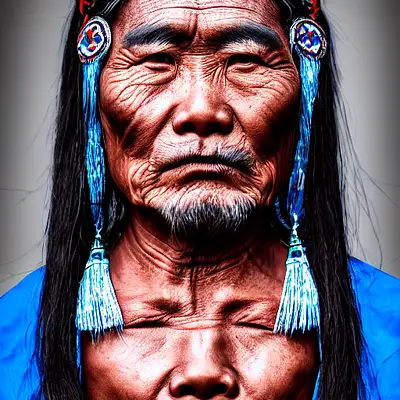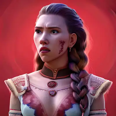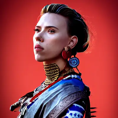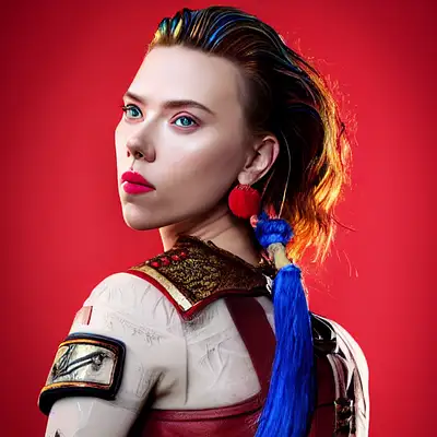 Scarlett Johansson portrait photo of a asia old warrior chief, sharp look, centered, red lips, long hair, frozen movie make up, blue on red, side profile, looking away, serious eyes, 50mm portrait photography, hard rim lighting photography--beta --ar 2:3 --beta --upbeta --beta --upbeta --beta --upbeta