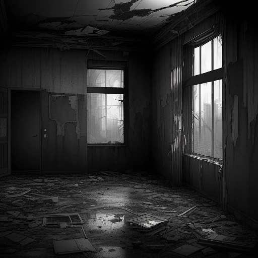 A detailed black-and-white manga-style illustration set in the universe of "The Last of Us. " The scene is inside an abandoned building with extensive damage and neglect. The illustration should have a dark gray filter to emphasize the mood of despair and desolation, with a rainy, gloomy atmosphere visible through broken windows or openings