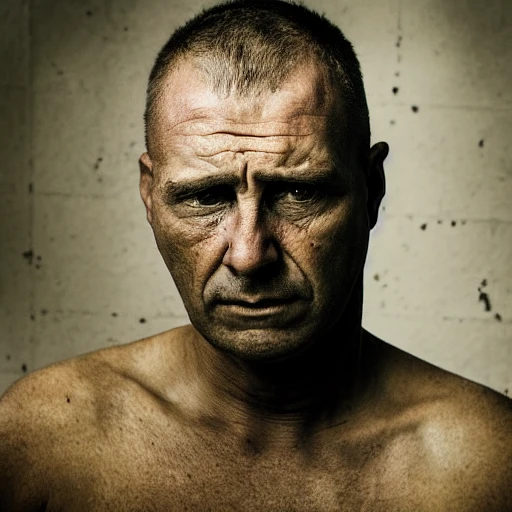 photograph portrait 45-year-old tough male prisoner, CLEAN SHAVEN, crying, stoic cinematic 4k epic detailed 4k epic detailed photograph shot on kodak detailed bokeh cinematic hbo dark moody --ar 1:1