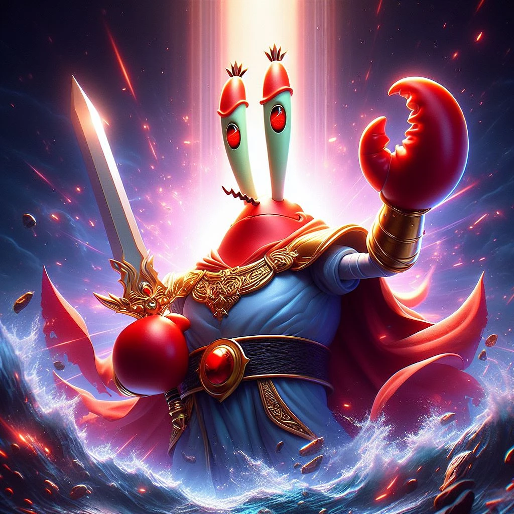 Mr. Crab is the mightiest god with a sword, red eyes, heroic pose, divine and celestial light, masterpiece, octane render, 8k, raytracing