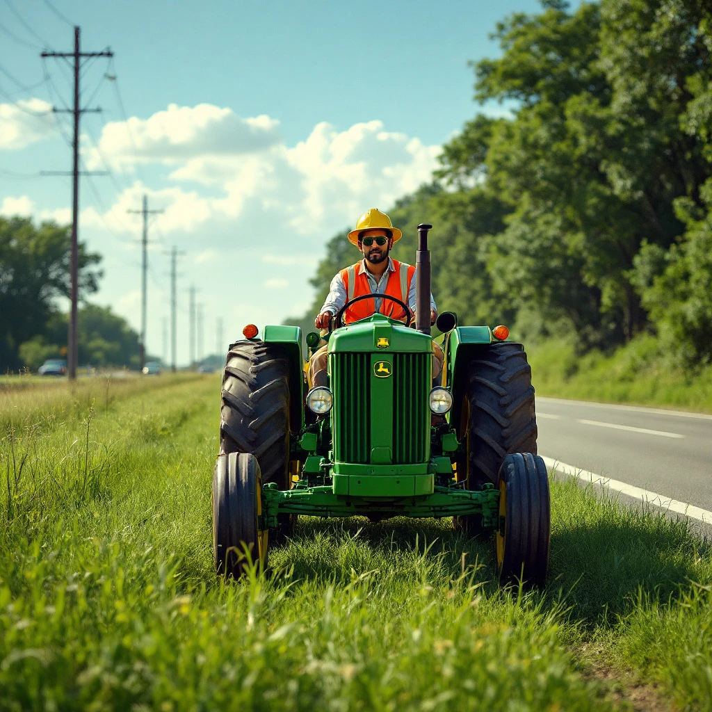 Create a cinematic picture of a green 1970’s John Deere tractor mowing the grass in the median of a highway interstate on a sunny day. The driver should be a young Indian man with dark skin, round sunglasses, a hard hat, and an orange work safety vest. The image should be in 16:9 aspect ratio and have a stylization level of 6. 0. Please ensure that the picture captures the sunny atmosphere, the vintage tractor mowing the median, and the details of the driver's appearance, while maintaining a realistic and visually appealing composition.