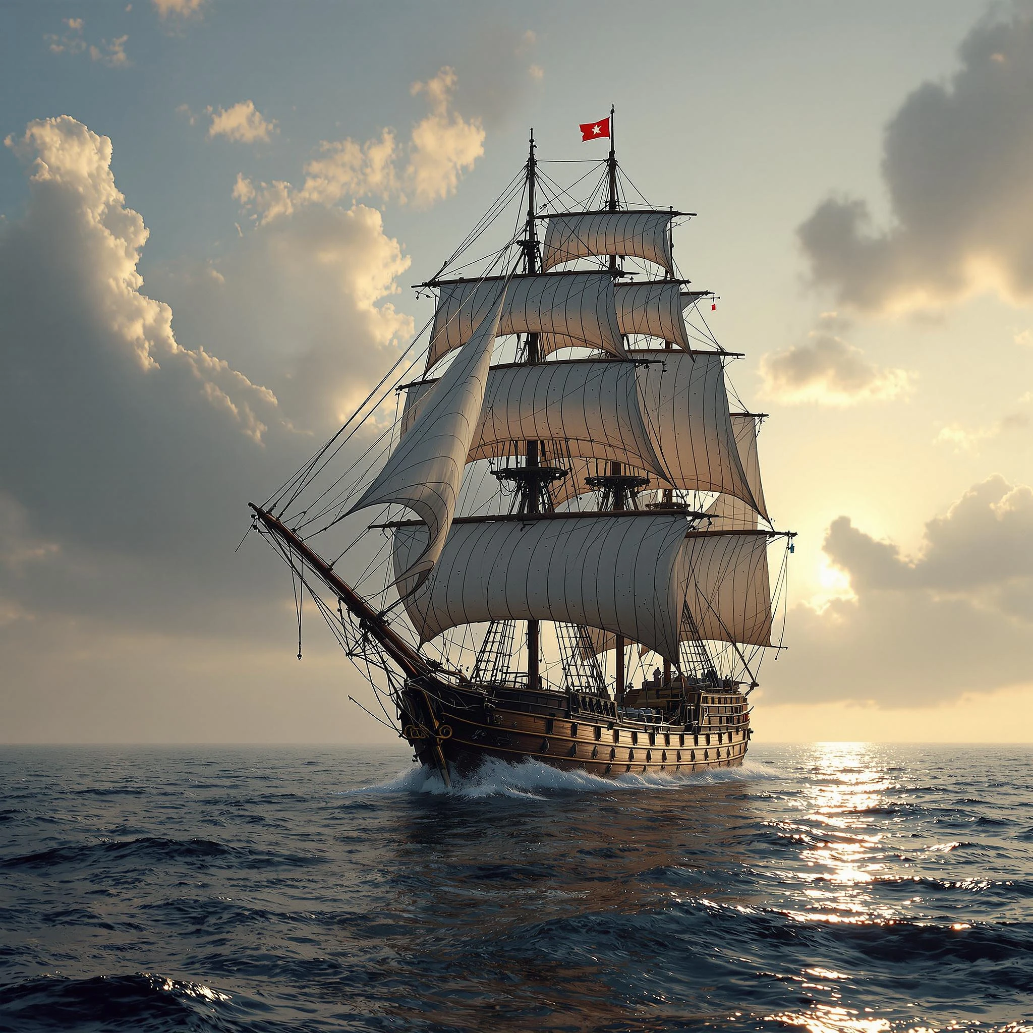 Photo of a ultra realistic sailing ship, dramatic light, pale sunrise, cinematic lighting, battered, low angle, trending on artstation, 4k, hyper realistic, focused, extreme details, unreal engine 5, cinematic, masterpiece, art by studio ghibli, intricate artwork by john william turner