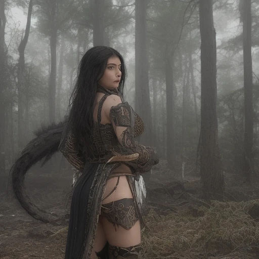 A majestic Norse warrior maiden stands tall, long sword in hand, against a ferocious black dragon. The maidens piercing green eyes gleaming with ferocity. Long, waist length, raven-black tresses cascade down her back, highlighting beautiful features. Her physique is a masterpiece of beauty and curves, accentuated by the fitted halter leather top and armor that hugs her form. The enormous, firm breasts are barely contained within the ornate leather, as if daring the world to gaze upon their splendor. Against this backdrop of a battle blood spatter dots her flesh as smoke swirls about the rustic village in flame, she stands determined, long sword in hand, ready to pounce, her imposing figure a testament to her unyielding strength and unshakeable will.