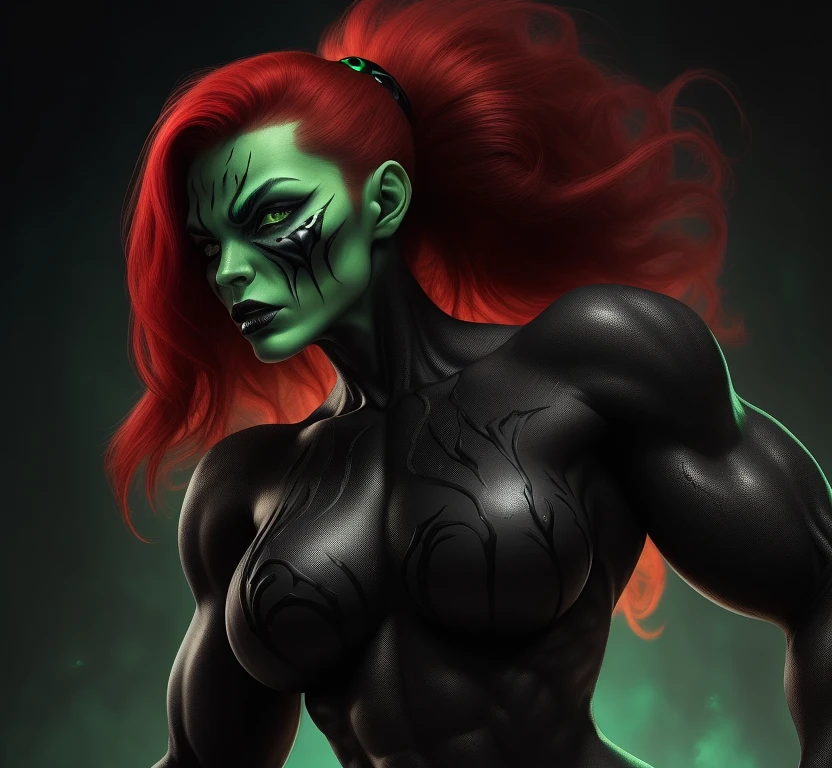 1 young beautiful bodybuilder woman with a wide strong jaw wearing a black alien symbiote, red hair, green eyes, SFW,