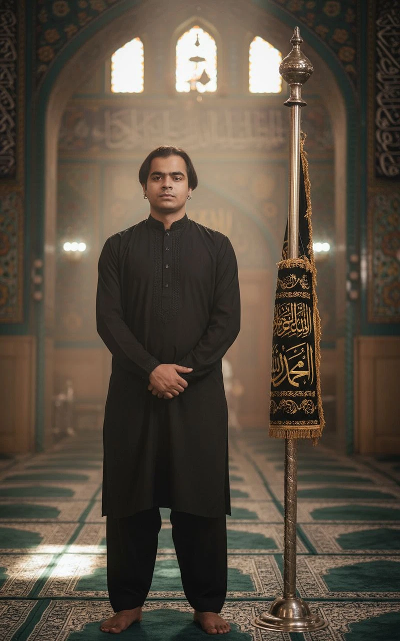 A photo-realistic UHD image of a young man his facial features remain exactly the same, with no changes to his face. He wears one small, silver hoop earring in each ear, adding a subtle yet refined touch of individuality and style. He is STANDING IN IMAMBARGHA HE WEAR a black traditional outfit, captured in a calm, reverent pose. The atmosphere is spiritual and respectful, illuminated by soft, diffused light that creates a serene glow in the surroundings. In front of him stands a symbolic representation of devotion and faith, rendered with deep reverence, The STANDING is minimalistic, focusing on emotion, respect, and quiet strength. keep my original face exactly the same-nop change to facial features. create a uhd image. i am STANDING IN IMAMBARGHA SHIA FAITH WEAR black traditional outfit. in front of me stands the Alam Mola Gazi Abbas.