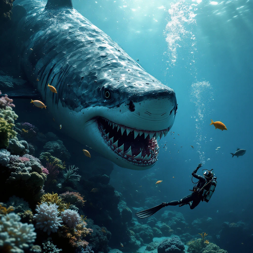 A scuba diver swimming on a reef getting attacked by a shark, intricate artwork . octane render, trending on artstation, t symmetrical artwork. cinematic, hyper realism, high detail, octane render, 8k